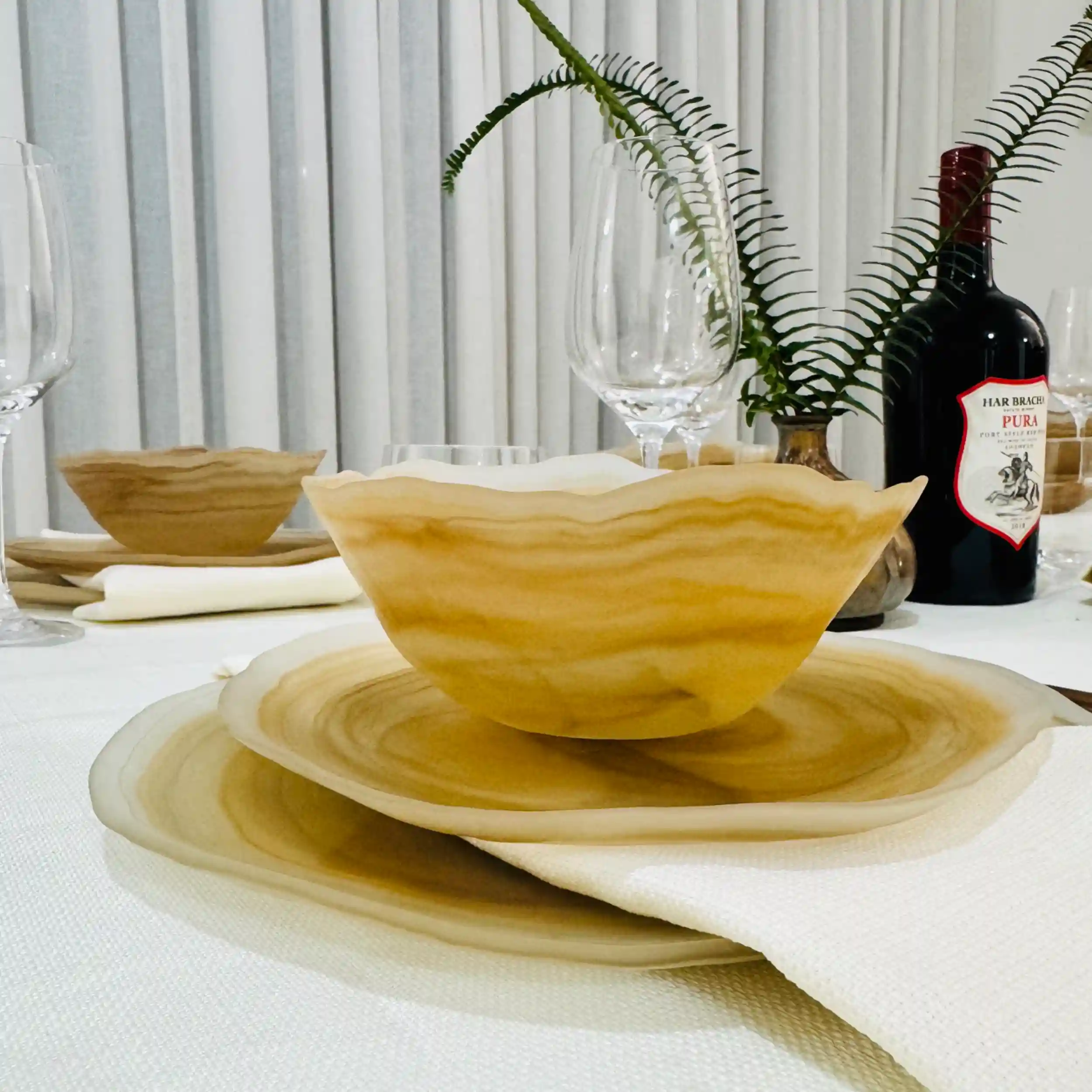 סט צלחות מזכוכית איכותית בגוון ענברי עשיר, עם מראה שיש טבעי. הזכוכית מוסיפה עומק וברק אלגנטי, בעוד הטקסטורה יוצרת תחושת יוקרה חמימה ומדויקת לאירוח מוקפד.